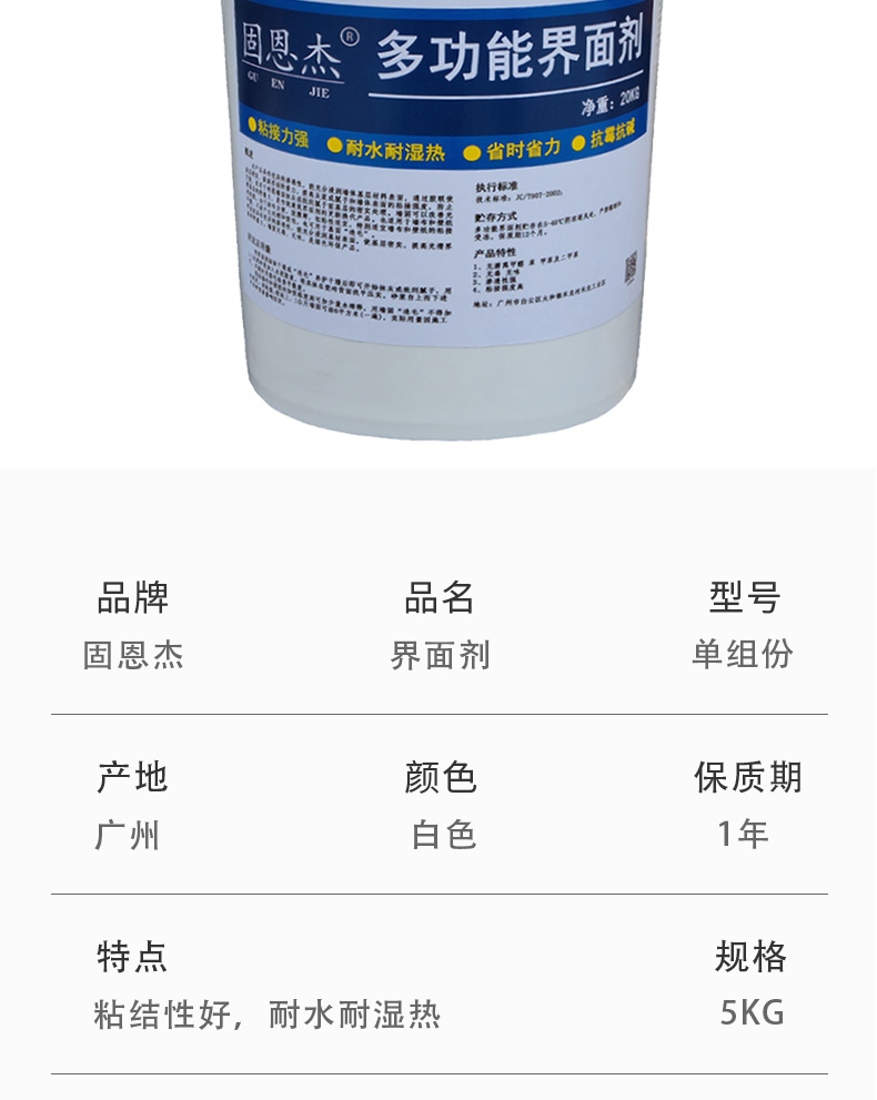品牌:固恩杰 规格:18KG 型号:单组份双组份 保质期:12月 生产地:广州 特色服务:免费样品 产品名称:界面剂 应用范围:固沙、拉毛、墙地基面增强处理。