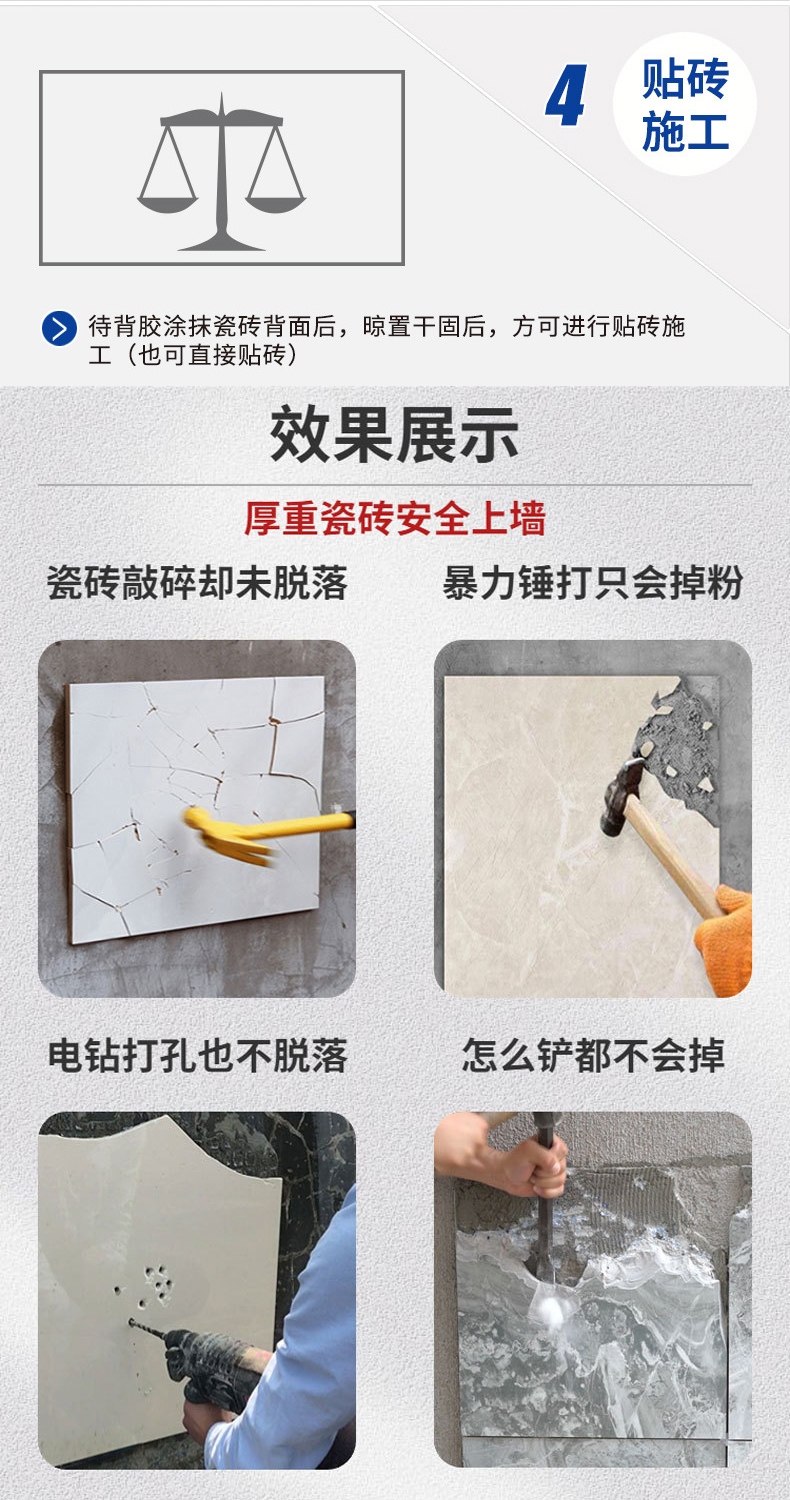 固恩杰瓷砖背胶柔韧性好,硬化收缩小,与水泥基粘结材料相容性强,粘结牢固。 用于室内外适用于砼框架横板拆除后的光滑改造;低吸水率的玻化砖、仿古砖、文化石、抛光砖、人造石、天然大理石、瓷片等上墙;防水泥批荡扇灰脱落;防外墙漆开裂变黄;老墙