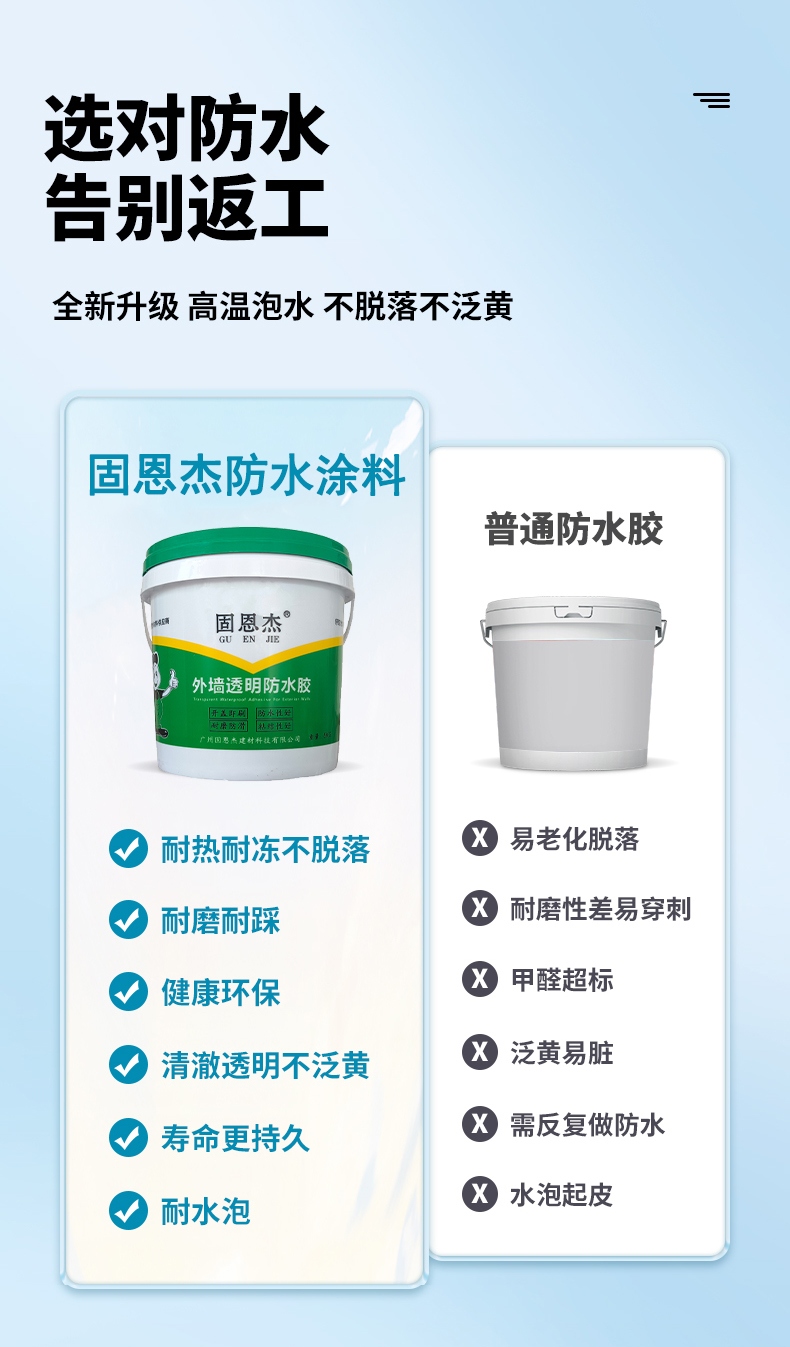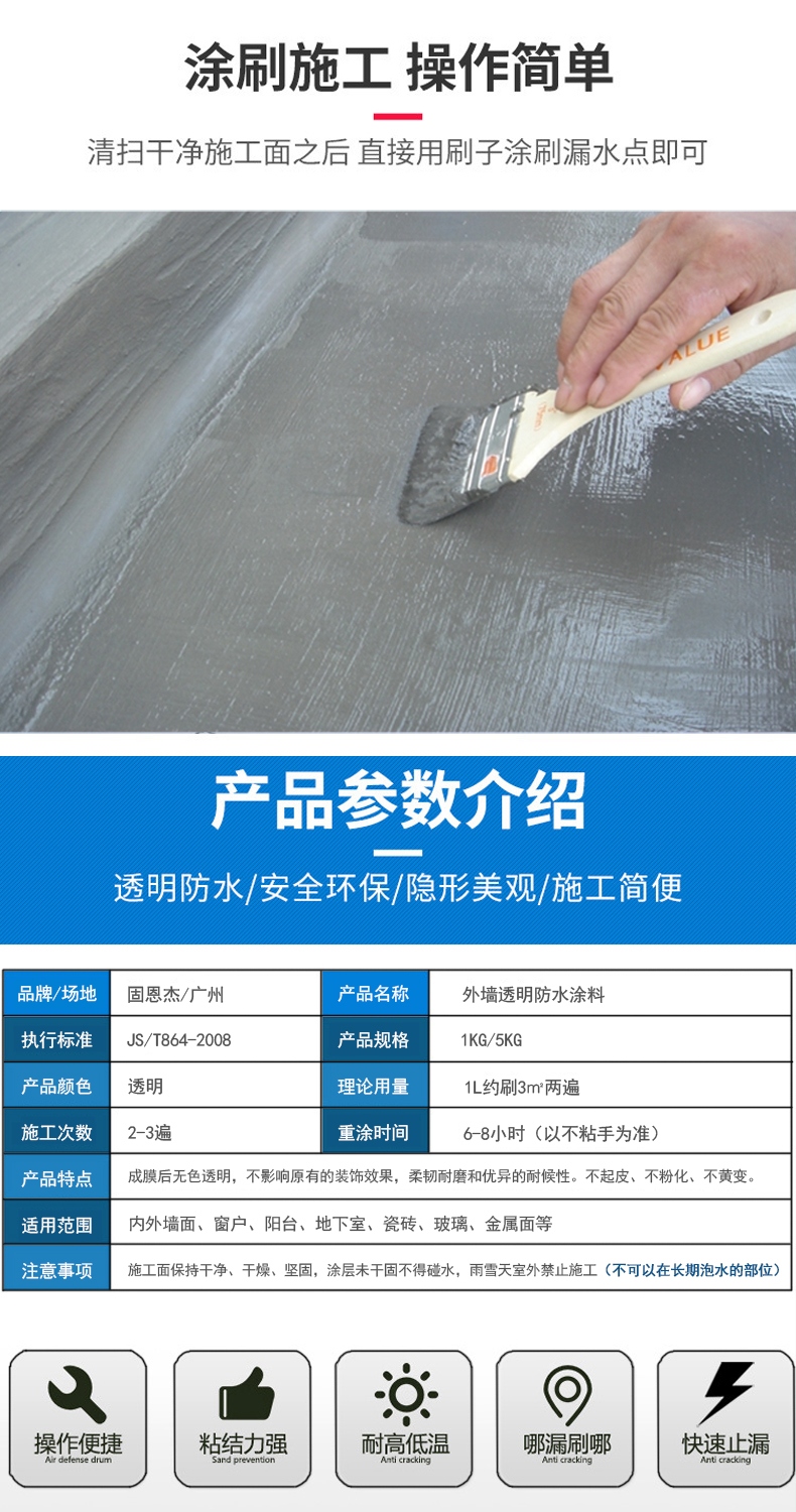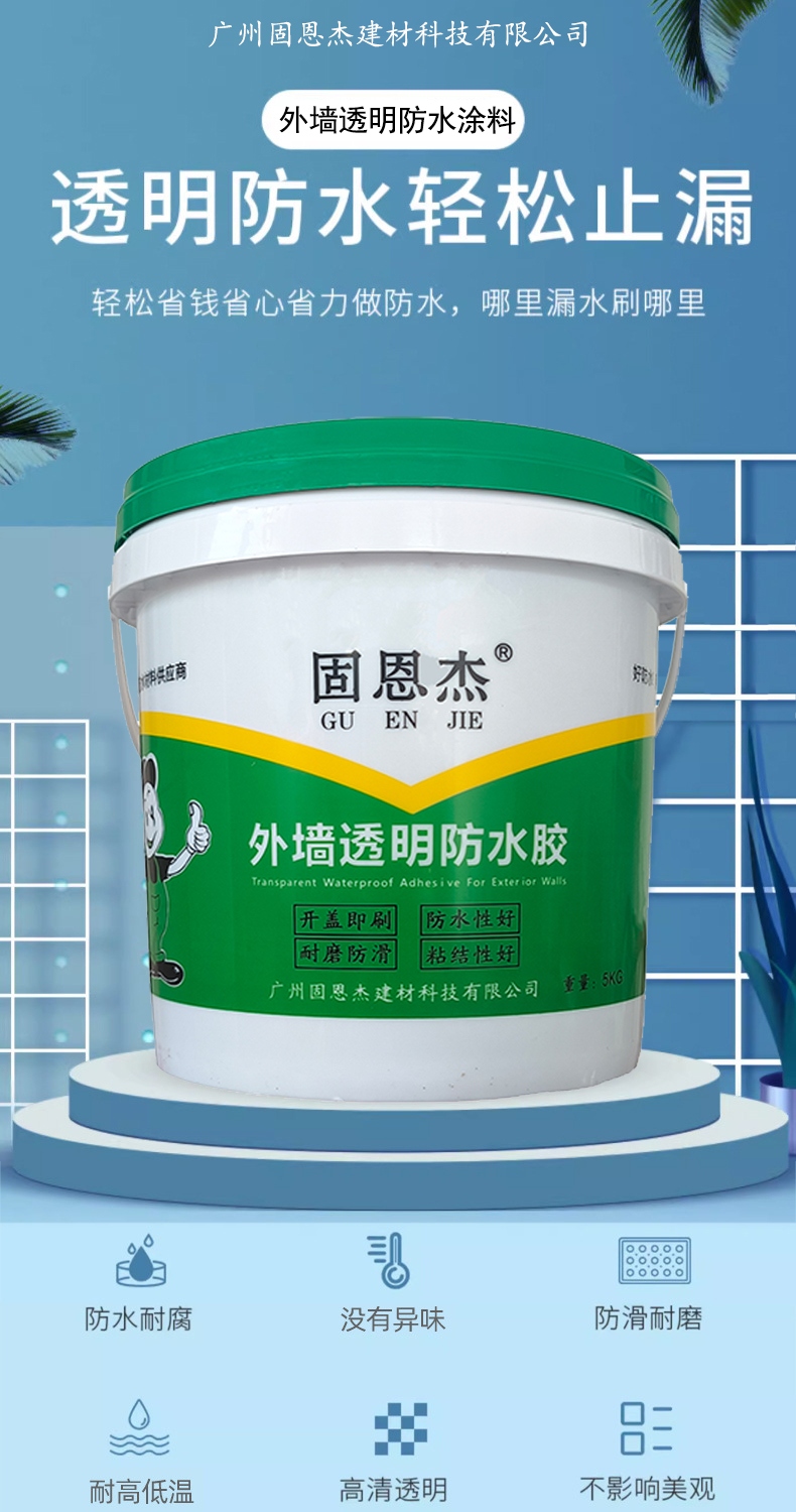 品牌:固恩杰 规格:1KG、5KG 型号:透明型 保质期:12月 生产地:广州 特色服务:免费样品 产品名称:外墙透明防水涂料 应用范围:卫生间、厨房、屋面、水池、地下室、阳台、天沟、外墙等